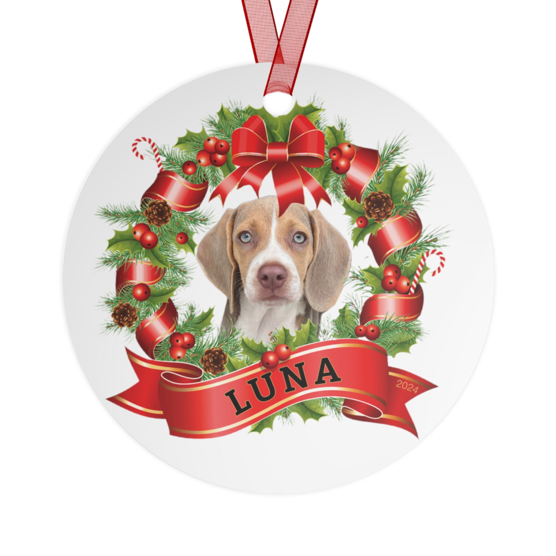 Metal Christmas tree ornaments are durable and will bring holiday cheer for years to come. Print your festive designs on both sides of the white aluminum base, and we'll print them in high resolution with a glossy finish. Their surface is scratch and chip-resistant, so they can be stored together in the famous Christmas decoration box. Choose any or all of these four shapes – bell, tree, round, and oval. Note that there's one ornament per pack, and it already comes with a separate red ribbon for hanging.